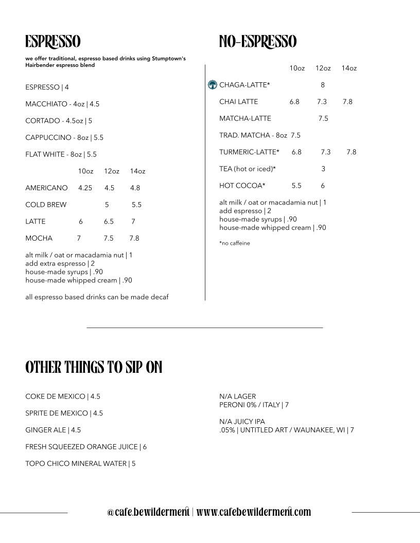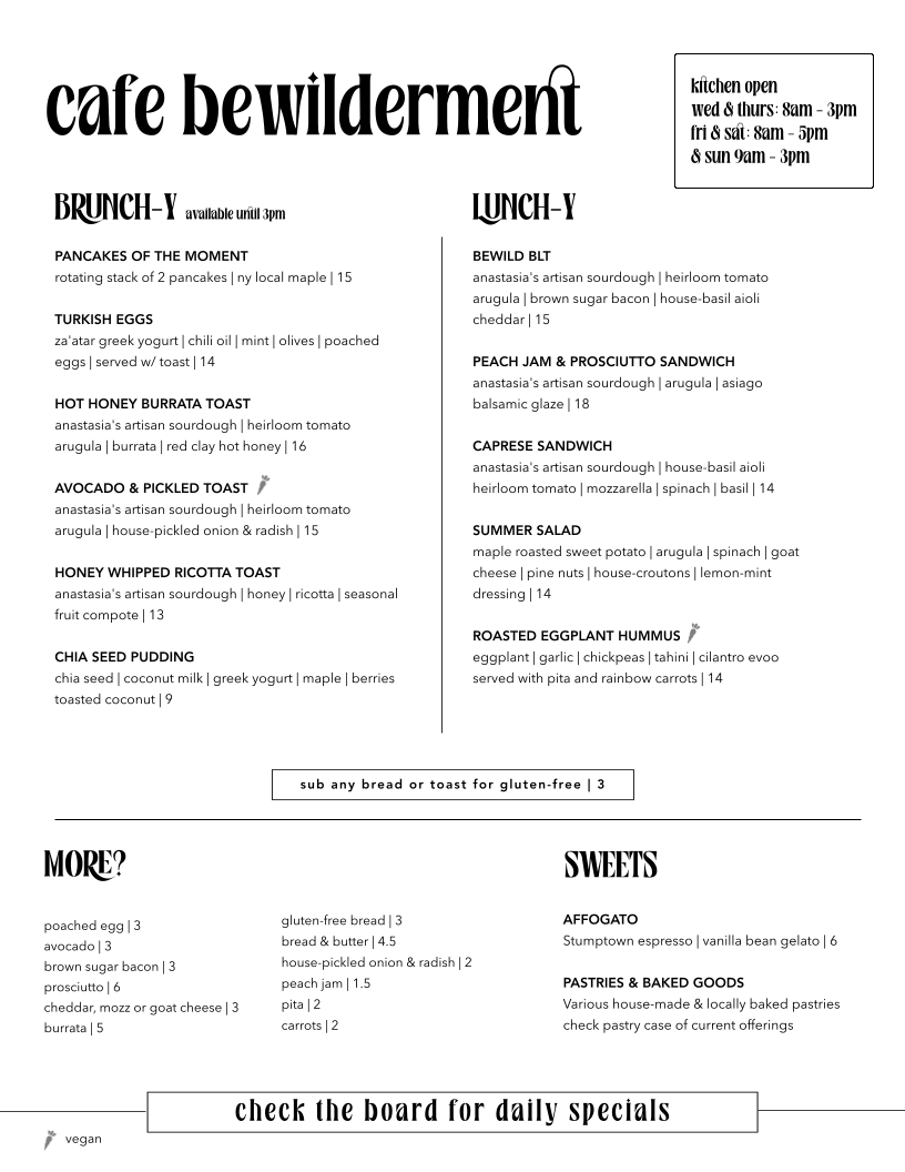 Cafe Bewilderment boasts a menu that will tantalize your taste buds with flavors that are lovingly crafted. Start your day with the Pancakes of the Moment, a rotating stack that embodies sweetness and creativity for just $15. For something unique, try the Turkish Eggs, featuring za'atar Greek yogurt, chili oil, mint, olives, and poached eggs, served with toast for an invigorating $14. Those craving a robust savory bite will adore the Hot Honey Burrata Toast, a marriage of creamy burrata and sharp heirloom tomatoes set against the contrast of spicy red clay hot honey for just $16.