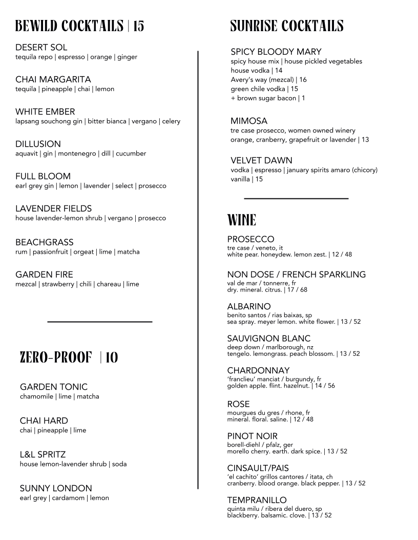 As you transition to lunch, the café’s creative flavors continue to impress. Dive into the Bewild BLT, layered with brown sugar bacon, heirloom tomato, and basil aioli—all nestled within an artisan sourdough for $15. Or savor the sweet and savory combination of the Peach Jam & Prosciutto Sandwich, perfectly accented with balsamic glaze for $18. Each bite tells a story of bold yet balanced flavors that reflect the warmth and heart of the community.